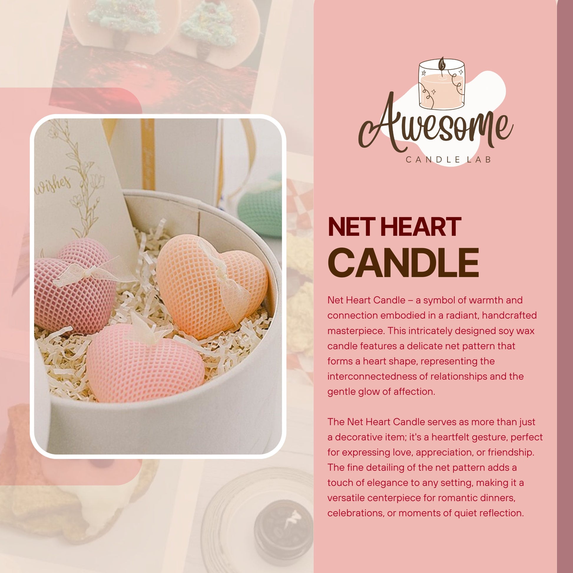 Net Heart Candle – a symbol of warmth and connection embodied in a radiant, handcrafted masterpiece. This intricately designed soy wax candle features a delicate net pattern that forms a heart shape, representing the interconnectedness of relationships and the gentle glow of affection.