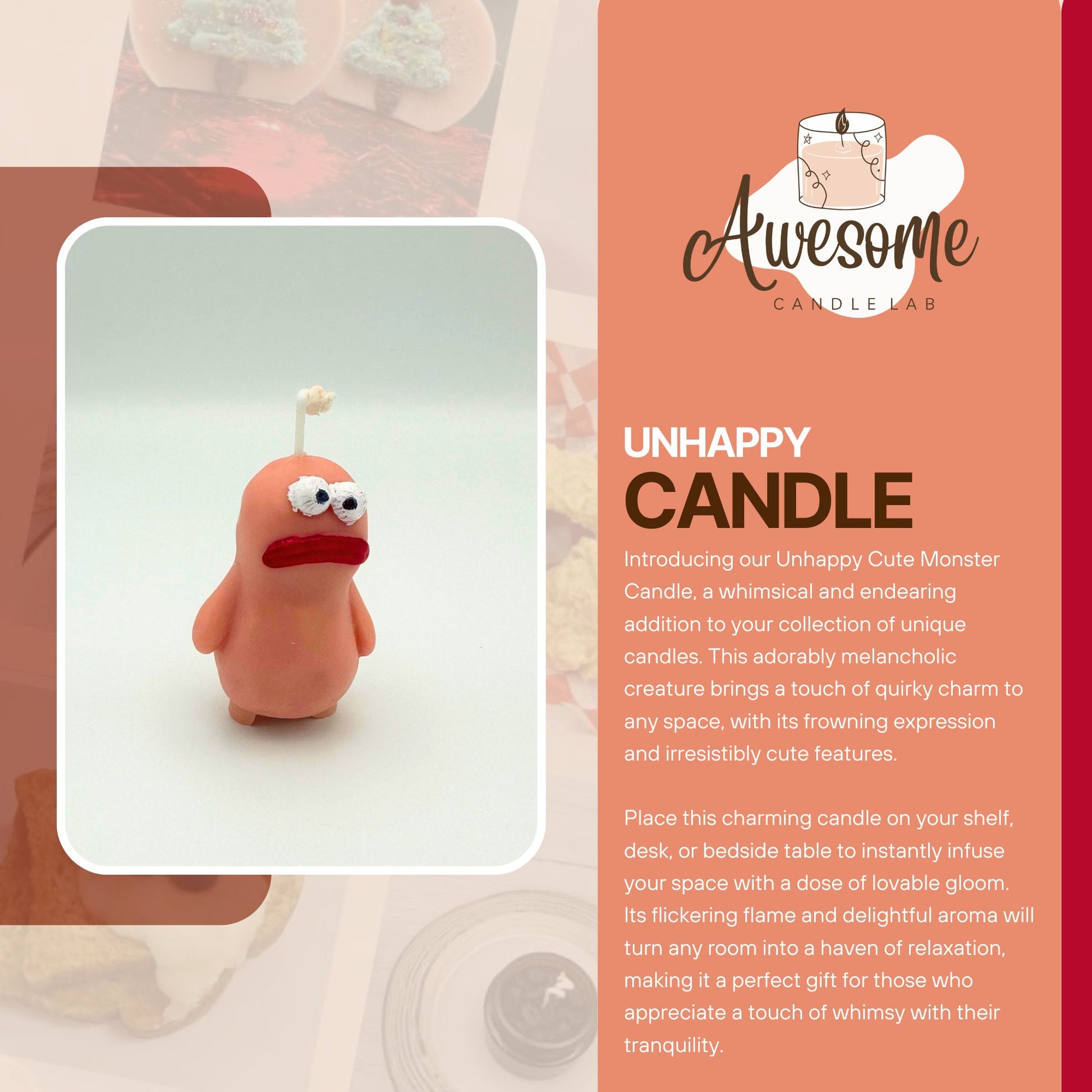 ntroducing our Unhappy Cute Monster Candle, a whimsical and endearing addition to your collection of unique candles. This adorably melancholic creature brings a touch of quirky charm to any space, with its frowning expression and irresistibly cute features.